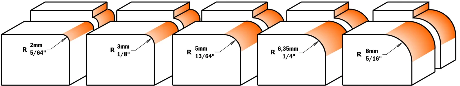 - Rayon R5 pour arrondir rapidement les bords des bois durs ou des panneaux MDF