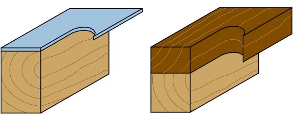 - Utilisez une fraise Ø 12.7 mm avec une longueur de coupe qui est légèrement supérieure à l’épaisseur de la moulure, tandis que le roulement de guidage suit le parcours du profilé depuis le côté opposé du bois