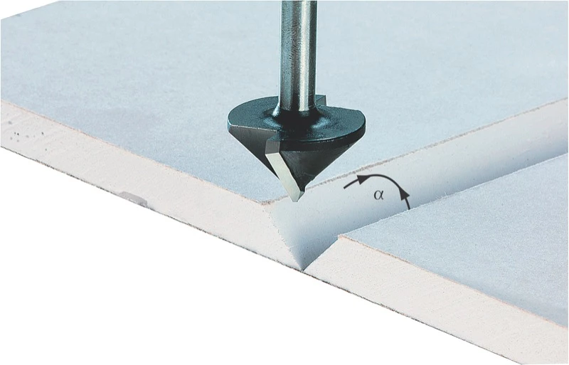 - Les plaques de plâtre peuvent être fraisées simplement avec la fraise à rainurer en V pour plaque de plâtre et le système de guidage (angles de 45° ou 90°)